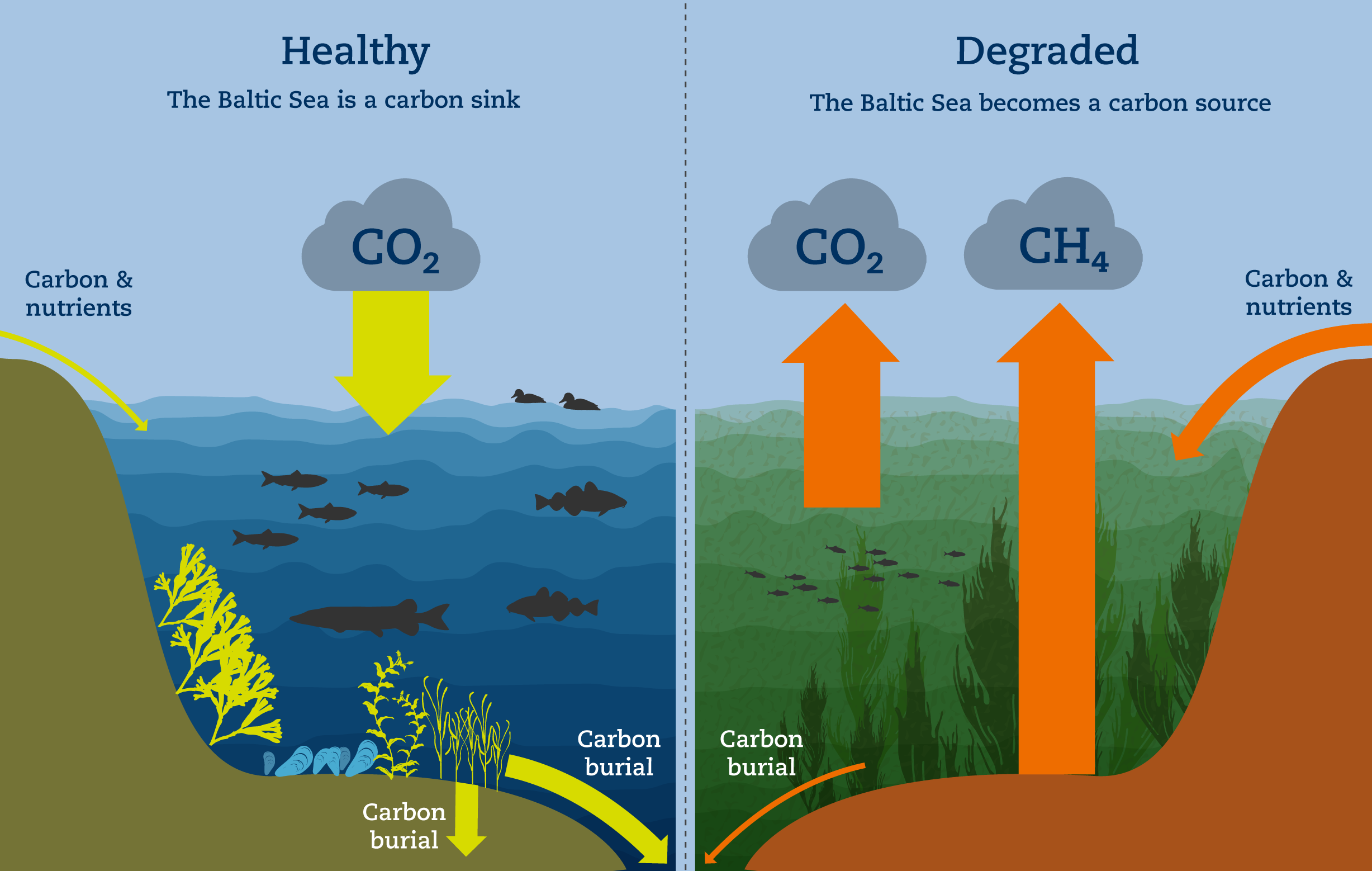 Scientists hypothesize that healthy coastal ecosystems with a high biodiversity work as effective carbon sinks. Degraded coastal ecosystems with lower biodiversity have limited carbon sink capacities and can be net sources of the climate-relevant greenhouse gases carbon dioxide (CO2) and methane (CH4).²⁰