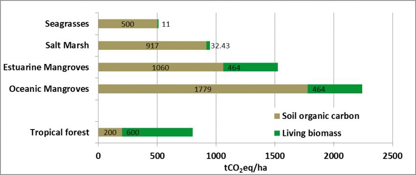 Carbon sequestration by coastal ecosystems is 50 times greater than that of terrestrial forests.