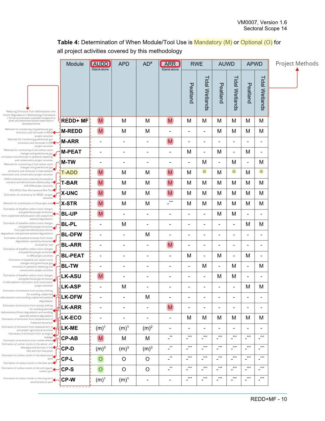 ARR projects must apply procedures in CDM methodology AR-ACM0003 (Afforestation and Reforestation of lands except Wetlands), but wetlands-related procedures are in the PEAT and TW modules. Described in BL-ARR and M-ARR.