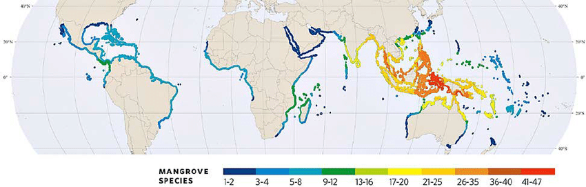 Mangroves have adapted to growing in saline conditions along the coastlines due to its aerial roots which assist to respire above the surface of the low-oxygenated water body ⁷⁶.