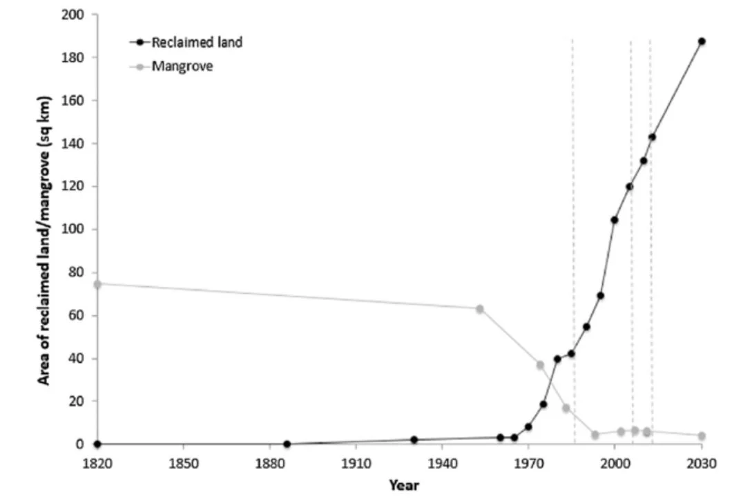 Fig. 2 Mangrove loss and land reclamation gains in Singapore from 1820 to the present day and predictions for the future⁹⁰
